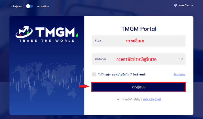 กรอกอีเมล และรหัสผ่านบัญชีเทรด ถัดมาคลิกตรง “ เข้าระบบ ”
