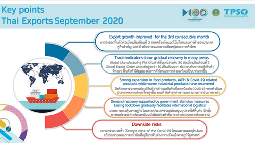 ปัจจัยที่ต้องนำมาพิจารณาในการประเมินสถานการณ์การส่งออกในปีนี้ ได้แก่ สถานการณ์การเลือกตั้งของสหรัฐฯ ซึ่งเป็นตลาดส่งออกหลักของไทยที่ยังมีความไม่แน่นอน นโยบายของผู้นำอาจมีผลต่อความเชื่อมั่นต่อการส่งออก การลงทุน และอัตราแลกเปลี่ยน สำหรับปัจจัยลบที่อาจกระทบการส่งออก ได้แก่ การระบาดของเชื้อไวรัสโควิด-19 ในหลายประเทศ โดยเฉพาะยุโรปที่กลับมาล็อกดาวน์ในรายพื้นที่อีกครั้ง ซึ่งอาจกระทบกำลังซื้อของประเทศคู่ค้า รวมถึงประเทศเพื่อนบ้าน เช่น เมียนมาที่การระบาดเข้าขั้นวิกฤติ อาจกลายเป็นอุปสรรคต่อการค้าชายแดนของไทยในระยะสั้น ขณะที่ปัจจัยสนับสนุนการส่งออก ได้แก่ ห่วงโซ่อุปทานของสินค้ากลับมาดำเนินการได้ตามปกติ การที่ไทยควบคุมการแพร่ระบาดได้ดี ไม่พบการติดเชื้อในประเทศ ทำให้ภาคการผลิตดำเนินการได้ตามปกติ รวมทั้งมาตรการกระตุ้นฟื้นฟูเศรษฐกิจของไทยและประเทศคู่ค้า